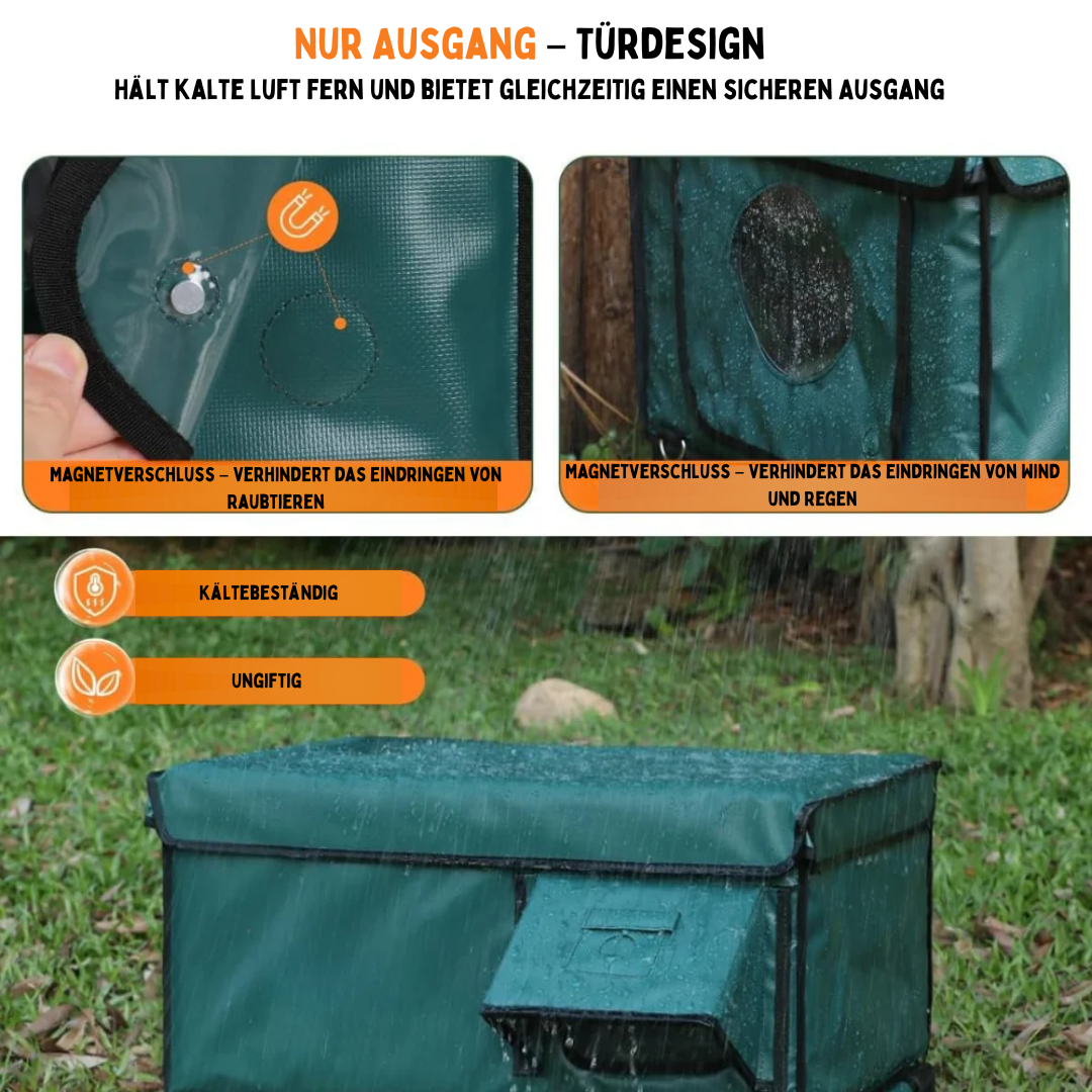 Das Livoria WarmNest hält Regen, Schnee und Wind zuverlässig draussen. Wasserfestes PVC und versiegelte Nähte sorgen dafür, dass deine Katze immer trocken und sicher bleibt.